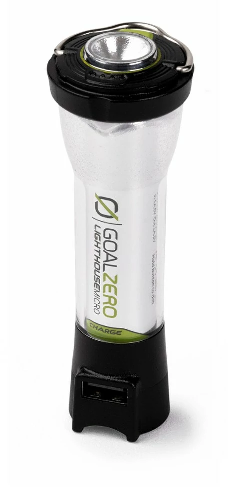 The Goal Zero Lighthouse Micro Charge lantern is a flashlight, hanging light and recharger. This all-in-one solution charges up from any USB port and stows easily in your purse or backpack.