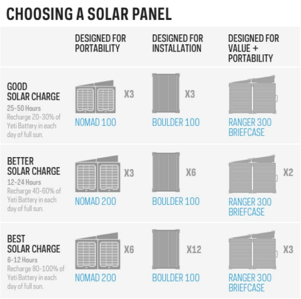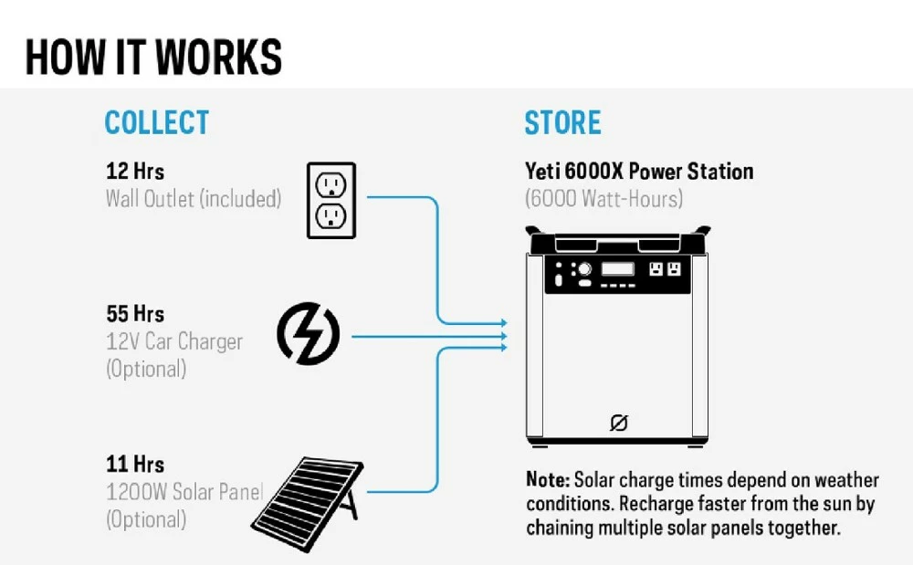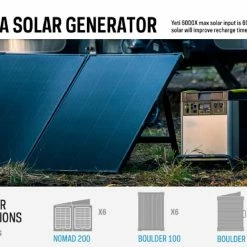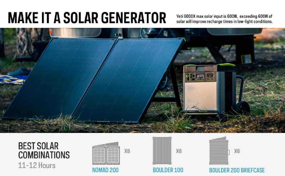 - Charge times depend on solar panel size; 2 x Boulder 200 Briefcases or Nomad 200 panels (not included) provide 400W and fully recharge the Yeti 6000X in 18–36 hours of sun