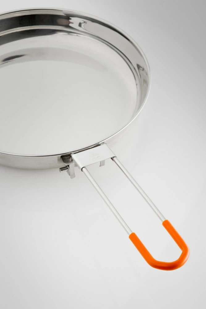 - Clad stainless steel frypan with folding, locking handle distributes even, controlled heat