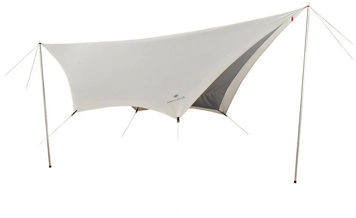 - Contents include: tarp main body, inner roof, wing pole 280 cm, wing pole 240 cm, Duralumin pegs (8), rope with tensioners, pole case, peg case and carry bag